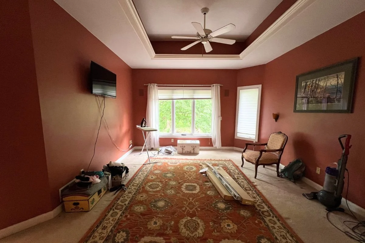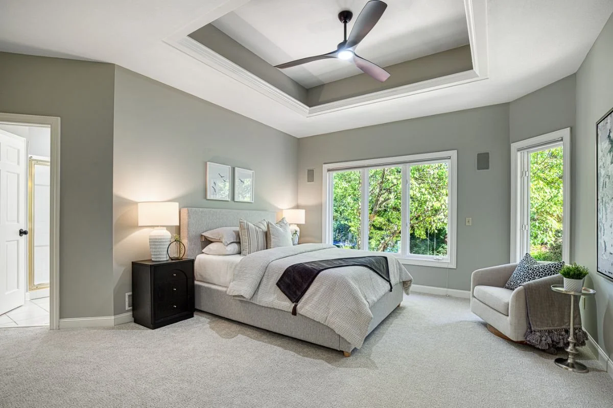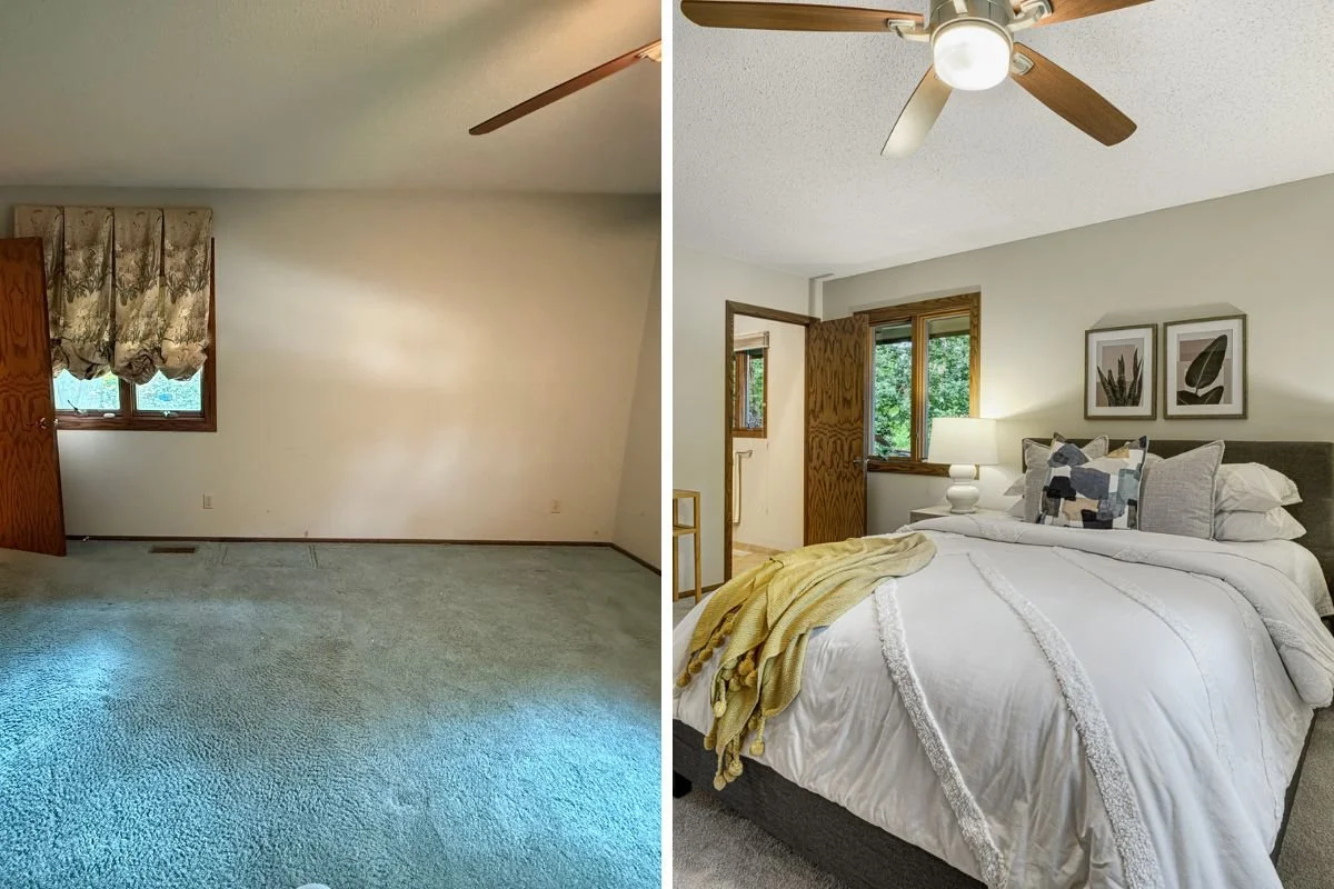 Removing style-specific window valances, along with the carpet update and staging, give this primary bedroom new life!