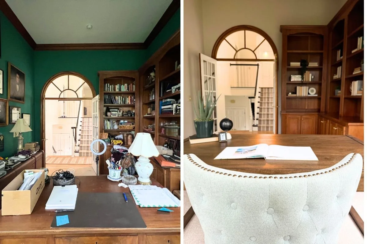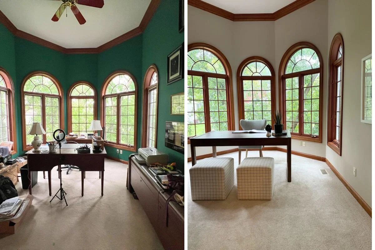 The office felt dark, dated and cluttered. Paint, carpet and staging brought calm and clarity to the space to inspire buyers.