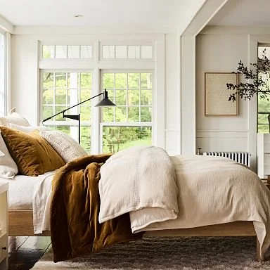 In the fall and winter months, add warmth to your home with luxe velvet bedding or throw pillows. Look for cashmere velvet, velvet mohair, or cotton velvet for a truly elegant and luxe home experience. For upholstery, we recommend performance velvet which has a blend of fibers (usually cotton and polyester) for durability.